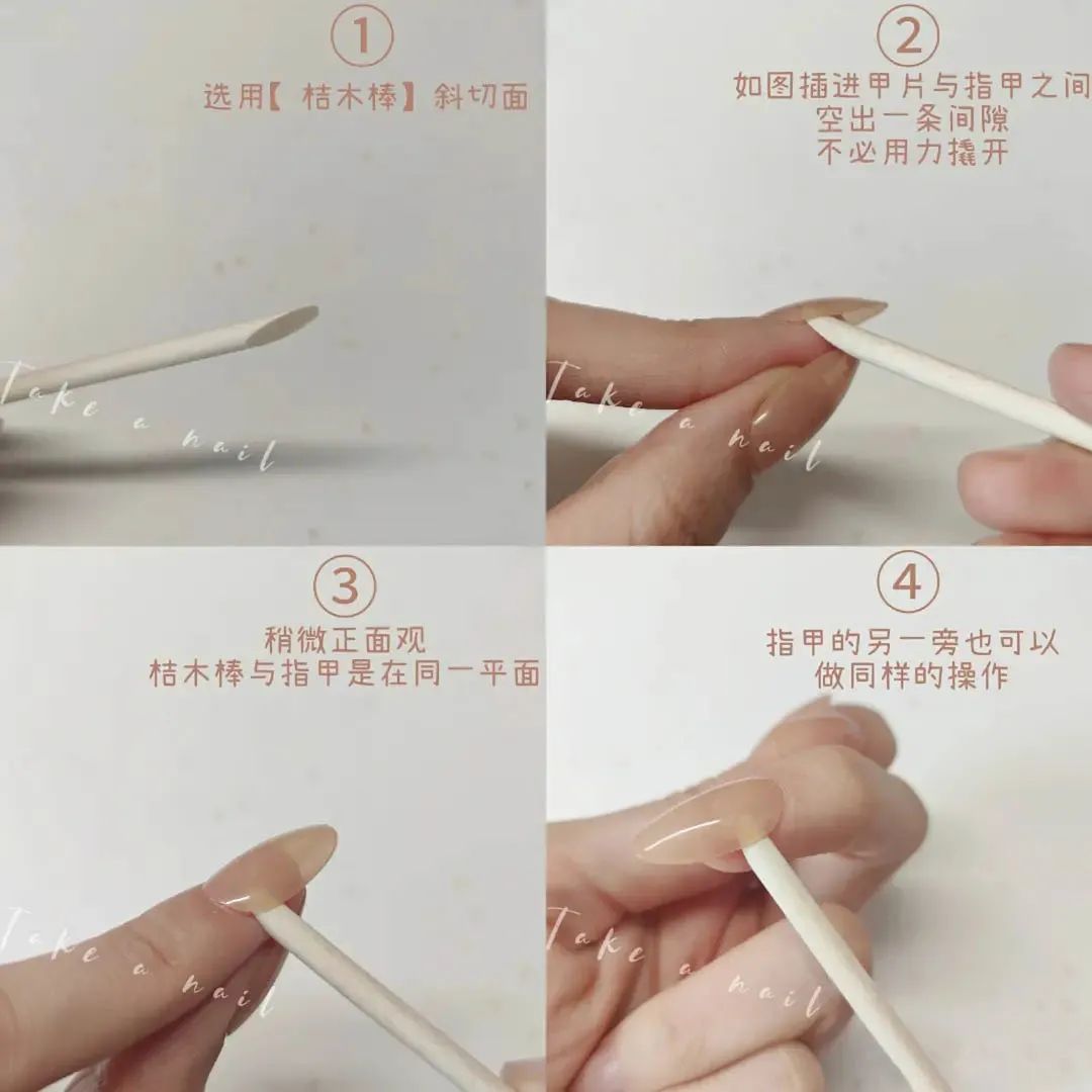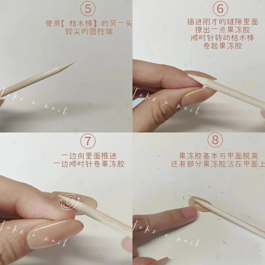 用桔木棒卸甲之前,记得先用水洗干净双手,如果特别怕痛可以用温水洗手,让指甲多泡3-5分钟让果冻胶软化,这样卸除的时候就没有那么疼啦!